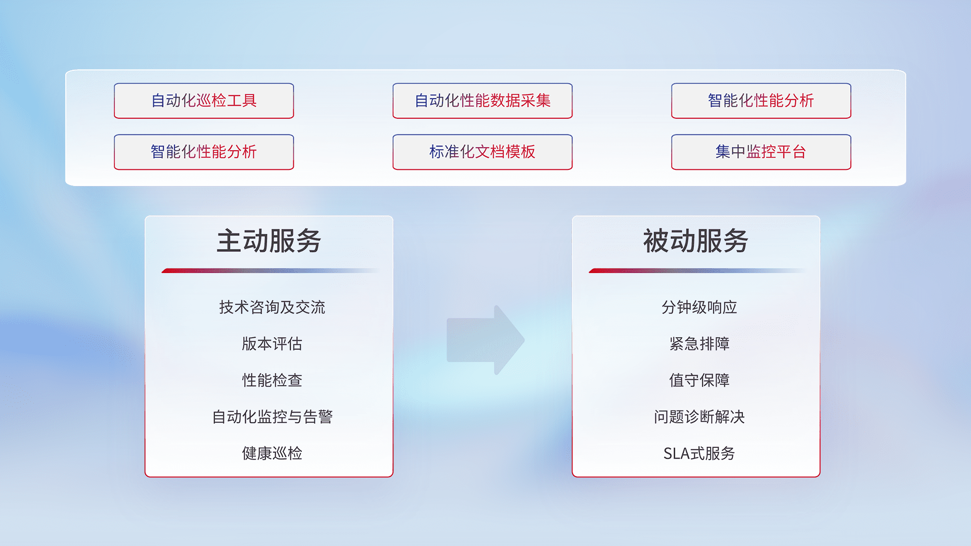 智能化工具和标准化文档,,,,保障服务质量,,,,提供主动服务(包含技术咨询、、、、版本评估、、性能检查、、、自动化监控与告警、、、、健康巡检)和被动服务包含(分钟级响应、、紧急排障、、值守保障、、问题诊断解决、、、SLA服务)。。。。